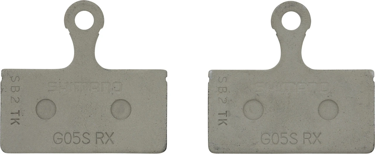 Die Shimano Bremsbeläge G05S-RX haben einen organischen Belag auf einer Stahl-Trägerplatte ohne Kühlrippen. Sie eignen sich für ältere XTR Bremsen, für XT, SLX, Deore, Alfine und für eine Reihe von gruppenlosen 2-Kolben-Scheibenbremsen. Im Vergleich zum Modell G03S konnte die Lebensdauer um ca. 40 % verlängert werden. Wie alle Kunststoff-Beläge von Shimano überzeugen die G05S-RX durch ihre Geräuscharmut und ihre gute Dosierbarkeit. Die Bremskraft ist überdurchschnittlich – bei optimaler Wärmeisolierung. Damit leisten diese Bremsbeläge sowohl bei Trockenheit wie bei Nässe zuverlässig ihren Dienst.